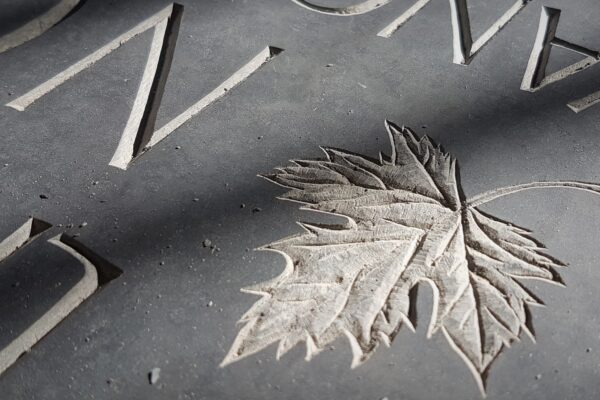 The majority of my work is carved by hand in the traditional way using a hammer and chisel. Lettering is v-cut, which helps the lettering to stand out in certain lights. Hand carved lettering always looks its best in a great raking side light, which produces a shadow on one side of the 'V' and can make the lettering really shine. This effect isn't really achievable in sandblasted letters as the blasting technique tends to produce more of a rounded, dished out effect.