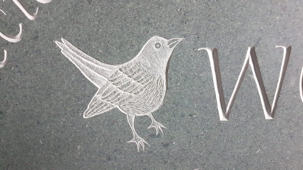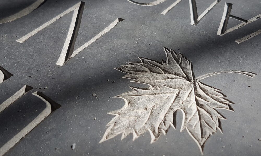 There is a wide array of both Scottish and UK sandstones suitable for carving. With sandstone it is important to choose one which is fine grained and thus holds fine detail. I tend to leave sandstone lettering unpainted, so will carve deep and design slightly bolder letters to stand out better. They range in colour from red sandstones like Corsehill and St Bees, through to grey/buff and creamier stones. A particular favourite of mine is York stone.